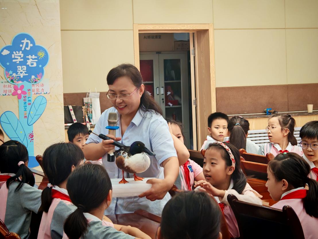 李老师用风趣幽默的语言,激发孩子们好奇心,形成课堂的积极互动。在讲座中李老师通过提出鸟为什么不怕淋雨、鸟的羽毛为什么会有鲜艳的颜色等问题,启发他们的思维,引导孩子们去思考,然后再通过仔细观察标本及老师的讲解更深刻的理解现象背后的本质。例如给他们讲解鸟的特性和羽毛的结构及特点时,让孩子们通过仔细观察标本各部位的羽毛形态及结构来理解和回答为什么不怕淋雨这一科学问题。在谈到如何保护鸟类、保护环境时,通过古诗、成语和生活中的保护小故事,让孩子们共鸣保护鸟类、保护环境人人有责的理念。整场讲座同学们沉浸式感受了科学的魅力。